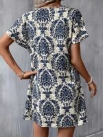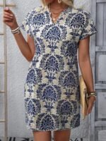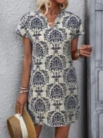 Kadın Kısa Kollu çentik Yaka çiçek Desenli Keten Elbise